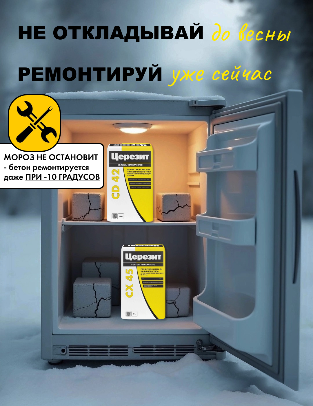 Зимние ремонтники Церезит CX 45 и Церезит CD 42 — позволяют работать даже при температуре до –10°C.