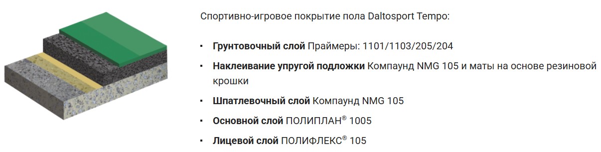 Одним из ключевых материалов обучения стала система Daltosport Tempo — наливное полиуретановое покрытие, которое монтируется на упругую рулонную подложку из резиновой крошки. Толщина покрытия начинается от 9 мм, что обеспечивает отличную амортизацию и долговечность.